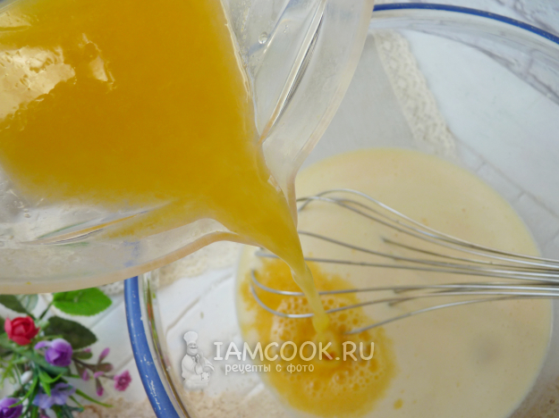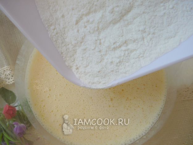 Всыпаю рисовую муку частями и тщательно размешиваю массу венчиком.