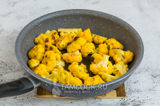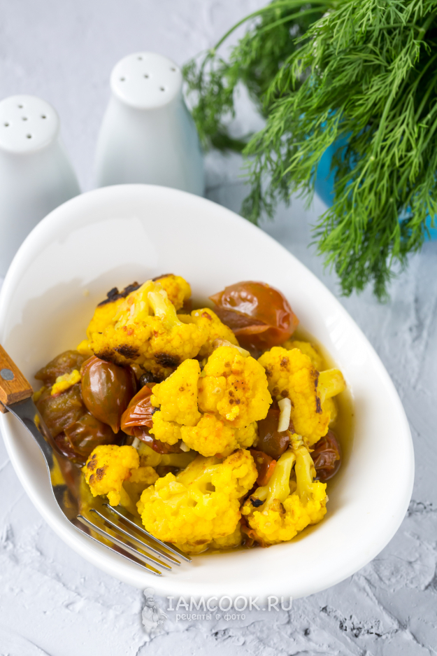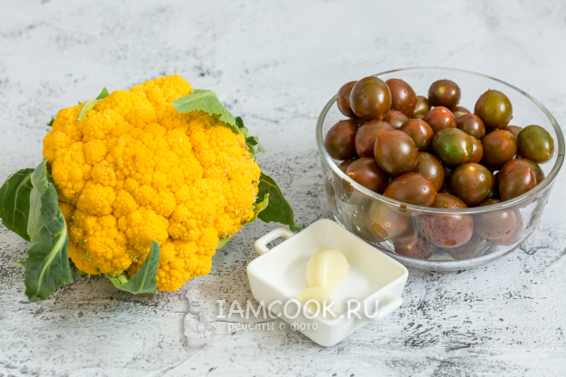 Для приготовления цветной капусты с помидорами на сковороде соберите продукты по списку.
