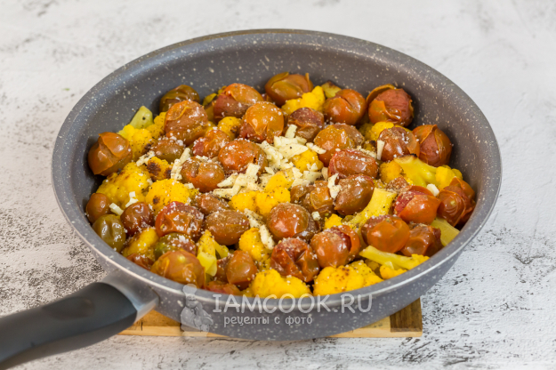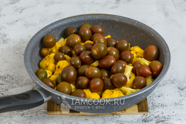 Добавьте помидоры: если это черри - целиком, если обычные - нарежьте, как удобно вам.