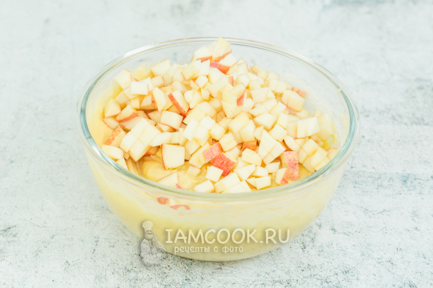 Яблоки нарежьте кубиками и добавьте в тесто. Очищать кожуру или нет - решать вам.