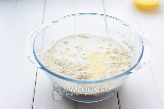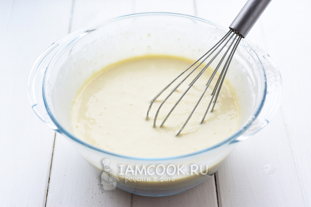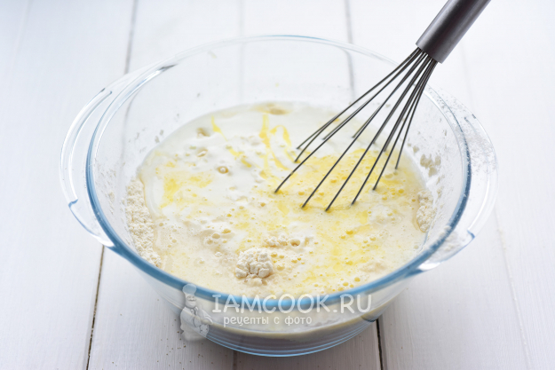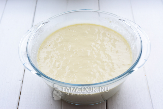 Перемешаем все ингредиенты венчиком до получения однородного достаточно жидкого теста. Если тесто вам покажется густоватым, то долейте немного теплой воды. Миску с тестом затянем пищевой пленкой и оставим в теплом месте на 30 минут.