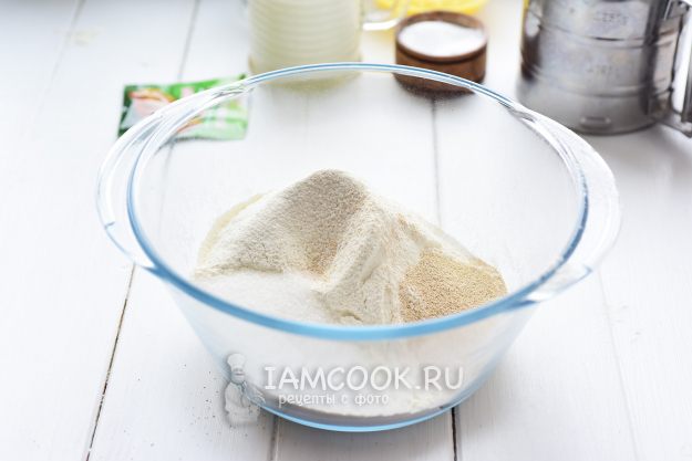 В миску просеем муку, добавим соль, сахар и сухие дрожжи. Перемешаем до получения однородной сухой смеси.
