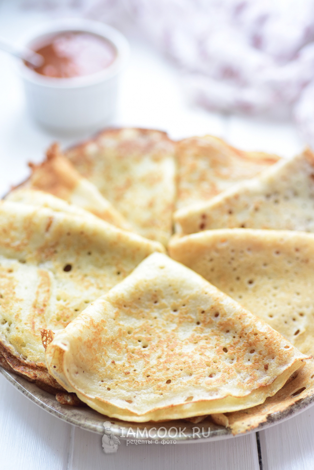 Тонкие дрожжевые блины на кефире с дырочками готовы. К столу подаём их горячими со сметаной или джемом. Приятного аппетита!