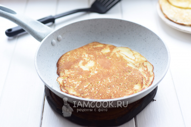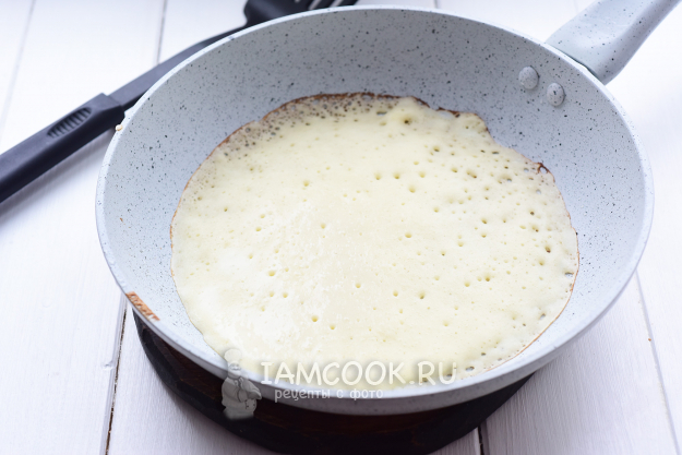 Сковороду смажем с помощью силиконовой кисти тонким слоем растительного масла, хорошенько разогреем на среднем огне и черпаком выльем на середину сковороды порцию теста. Распределим тесто равномерно по горизонтальной поверхности, перекатывая сковороду из стороны в сторону. Пару минут обжарим с одной стороны.