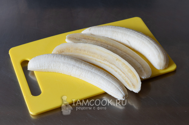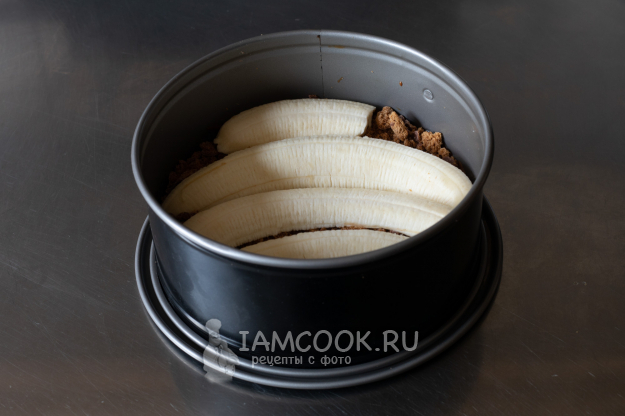 Утрамбовать слегка увлажнённую пряничную массу на дно формы поверх кондитерской бумаги. Выложить поверх слоя пряничной крошки половинки бананов разрезом вниз.