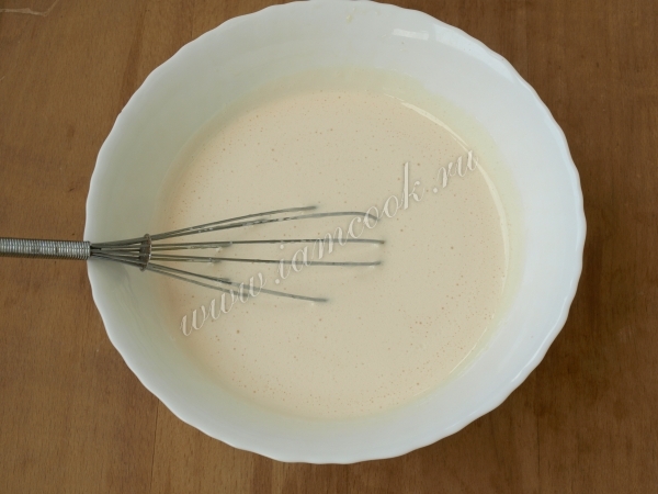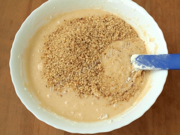 Затем влить молоко и подсолнечное масло. Постепенно просеять муку, смешанную с разрыхлителем и щепоткой соли. Добавить в тесто ореховую крошку и перемешать. Тесто будет как густая сметана.