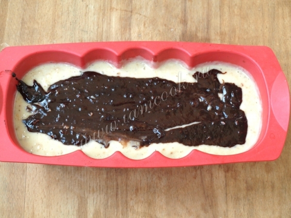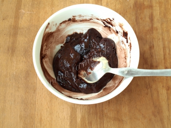 Отобрать 3-4 столовых ложки теста в отдельную миску, добавить туда по 2 столовых ложки подсолнечного масла и какао. Хорошо перемешать тесто.