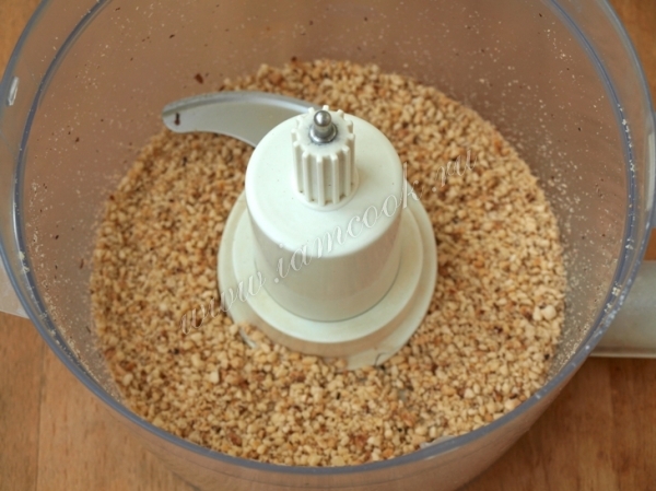 Фундук обжарить на сковороде, остудить и очистить от скорлупы. Затем при помощи комбайна измельчить в крошку.