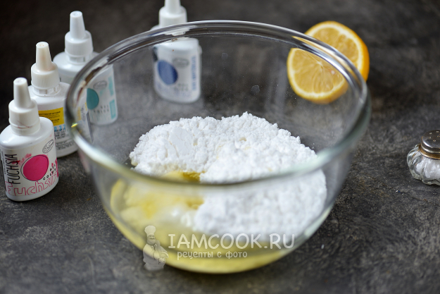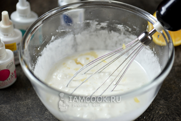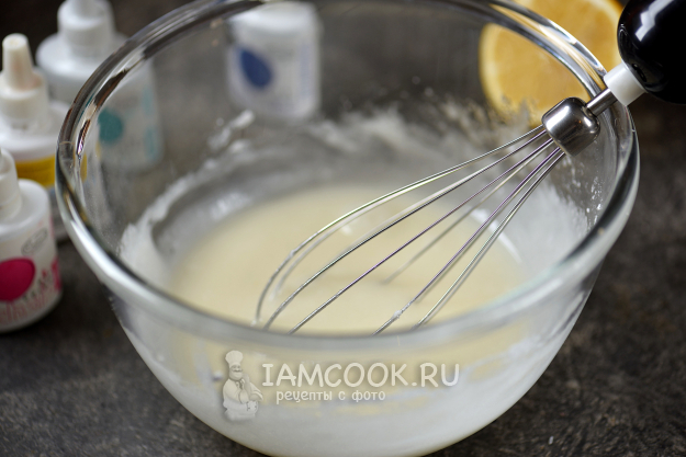 Затем включите миксер и пробейте всё около минуты, масса должна хорошо побелеть и слегка загустеть. Сильно густой глазурь тоже быть не должна. Выдавите небольшой ломтик лимона в миску, пробейте еще секунд 30.