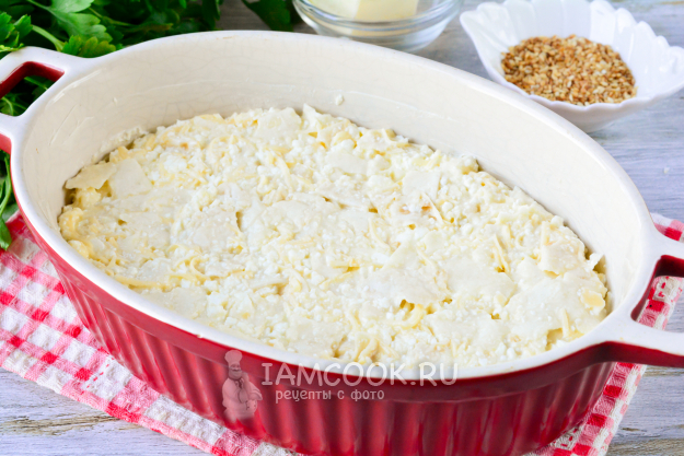 Форму для запекания смажьте сливочным маслом, выложите тесто из лаваша, разровняйте всю поверхность.