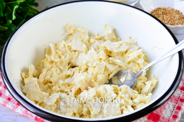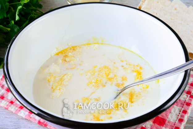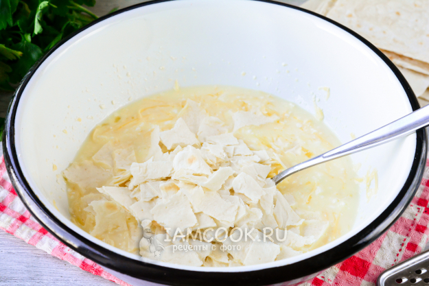 Лаваш поломайте на мелкие кусочки и добавьте в жидкую часть теста.