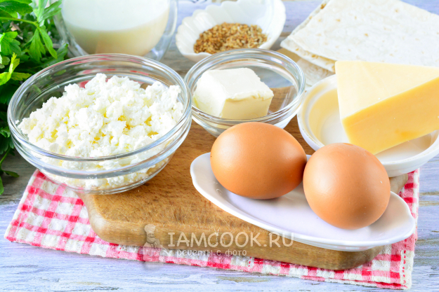 Перед вами все ингредиенты для приготовления рваного пирога из лаваша с творогом и сыром.