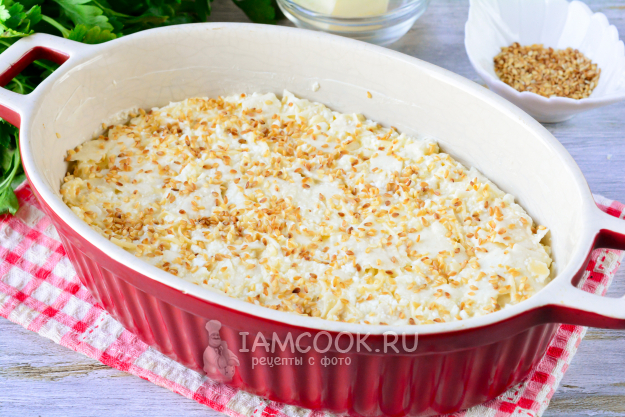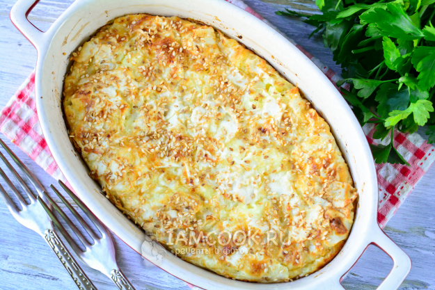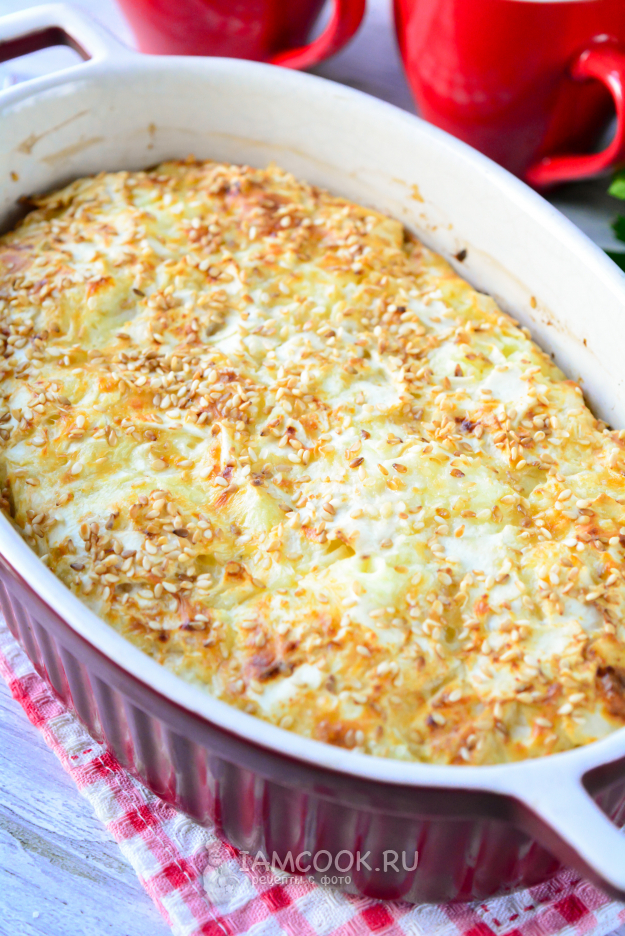 Присыпьте пирог кунжутом и отправьте запекаться в духовку.