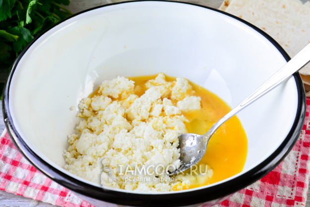Яйца вбейте в глубокую миску и взболтайте вилочкой. Добавьте творог и перемешайте.