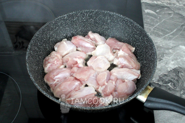 Разогрейте сковороду. На смеси сливочного и подсолнечного масел обжарьте куски курицы в течение 5 минут на сильном огне при помешивании. Слегка посолите.
