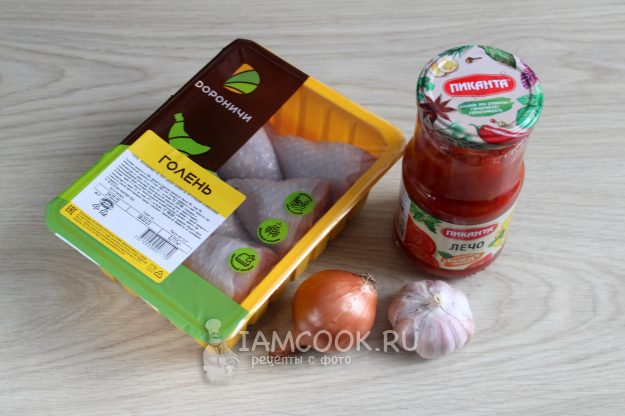 Под лечо имеется в виду покупная или домашняя консервированная заготовка, а не замороженная смесь. Кроме голеней, подходит мясо и с других частей курицы либо в виде филе, либо кусочки на кости.