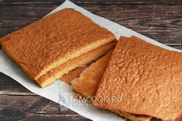 Подравняйте края коржей и разрежьте пополам. Получится 4 коржа. Обрезки измельчите в процессоре для обсыпки торта.