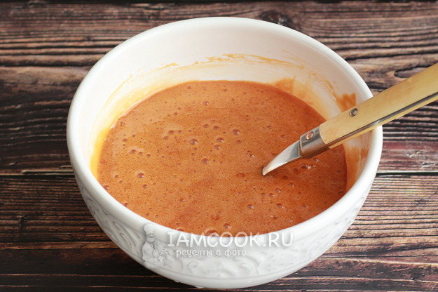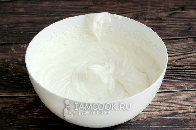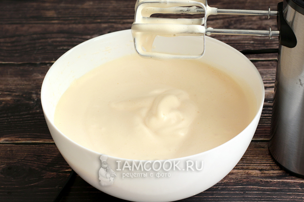 Затем тонкой струйкой начните вливать карамель, не прекращая взбивать смесь миксером. Состав станет жиже, но пышность будет сохраняться.