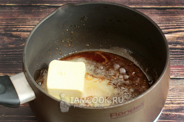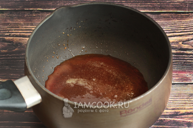 50 г сахара растопите в ковшике с толстым дном. Огонь делайте маленьким, чтобы сахар не горел. Добейтесь гладкой текстуры, чтобы все крупинки растворились.