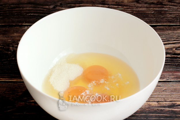 Яйца взбейте с 50 г сахара (я уменьшила до 30 г), солью и ванилином. Если миксер у вас мощный, то взбивайте яйца, не разделяя на белки и желтки, если не уверены в мощности, то сделайте это по очереди. У меня ручной миксер 450W, яйца взбились за 4 минуты.