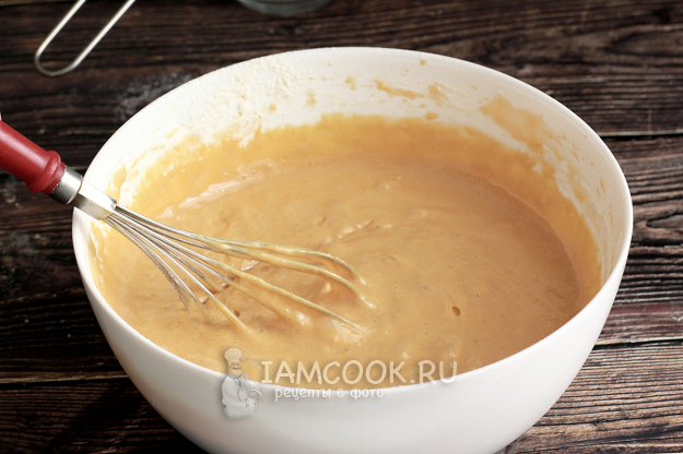 Малыми порциями просейте в смесь муку. Размешивайте ее ручным венчиком, он делает это так, что тесто не опадает. Смотрите, если получается очень жидко, то добавьте еще ложку муки, мне хватило 150 граммов.