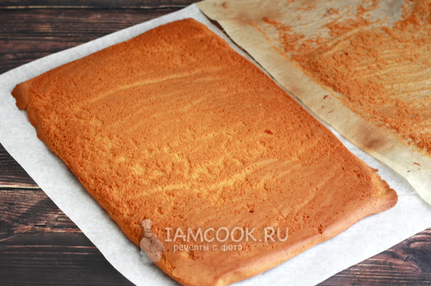 Снимите мягкий корж с противня вместе с пергаментом и сразу переверните его на чистый лист антипригарного пергамента, затем снимите старый пергамент. Остудите. Испеките еще один корж подобным образом.
