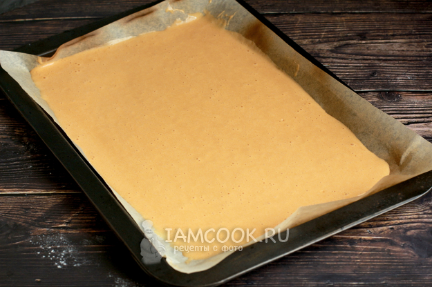 Должно получиться пышное тесто. Разделите его пополам или сразу вылейте на большой противень, а потом разрежете на коржи. Я выпекала 2 коржа на противне 23 на 33 см по внутреннему краю.