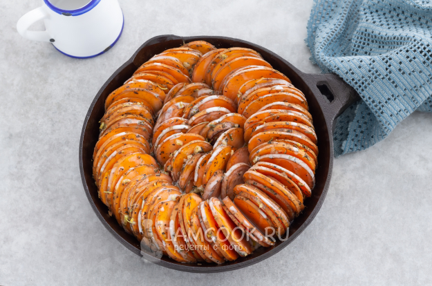Хорошо все перемешайте, чтобы заправка покрыла каждый ломтик батата.