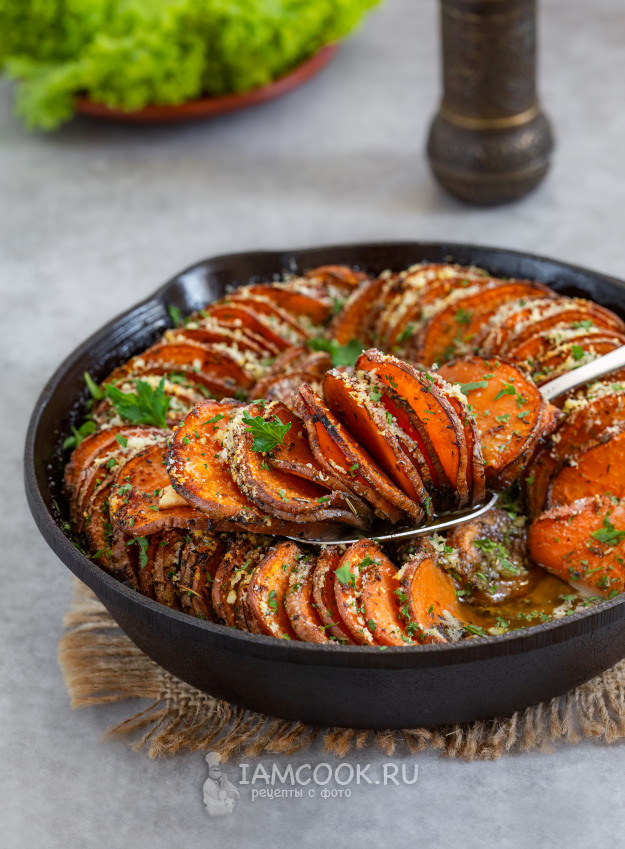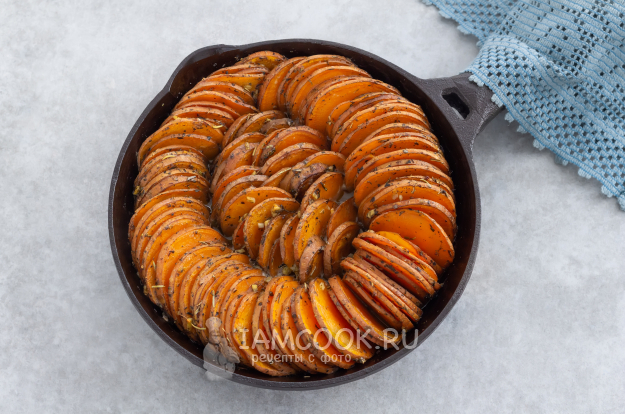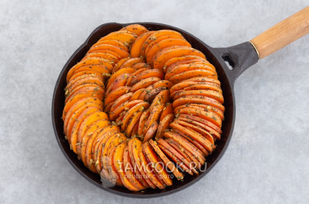 Добавив сливки, поместите форму в духовку еще на 20-25 минут, уже не накрывая фольгой. За это время часть сливок впитается, ломтики батата станут еще более нежными и слегка подрумянятся по краям.