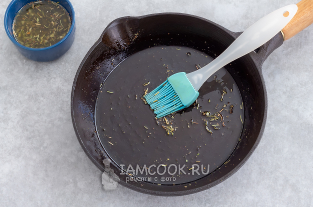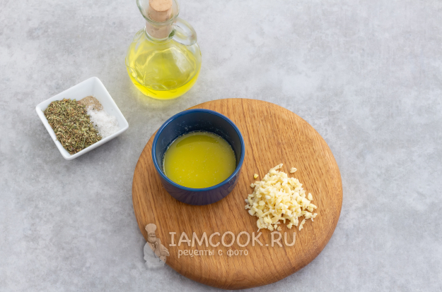 Приготовьте масляную заправку. Растопите сливочное масло. Очистите и мелко нарежьте зубчики чеснока. В небольшой емкости соедините сливочное и растительное масло. Добавьте нарезанный чеснок, сушеные травы, соль и молотый черный перец. Хорошо всё перемешайте.