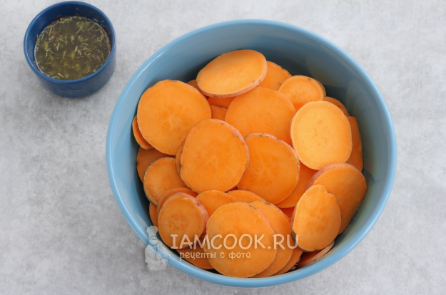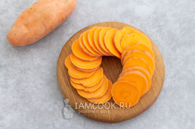 Тщательно вымойте, обсушите батат и, не очищая от кожуры, нарежьте тонкими кружочками толщиной примерно 2-3 мм.