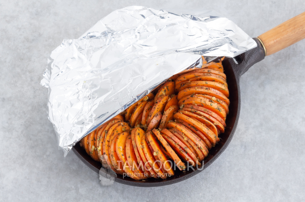 Накройте форму фольгой, поместите в духовку и выпекайте батат 45-50 минут.