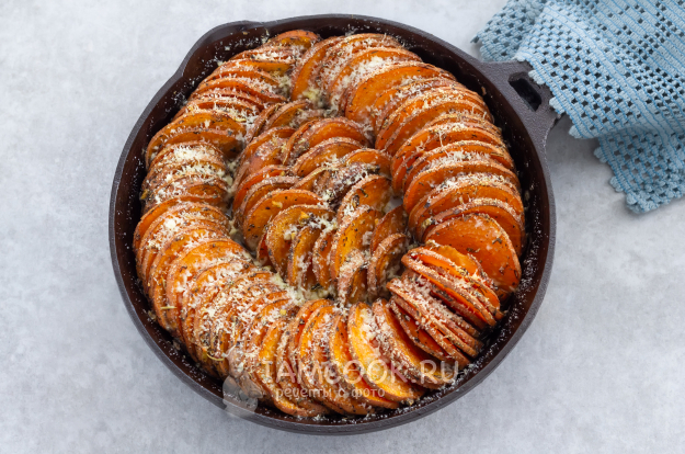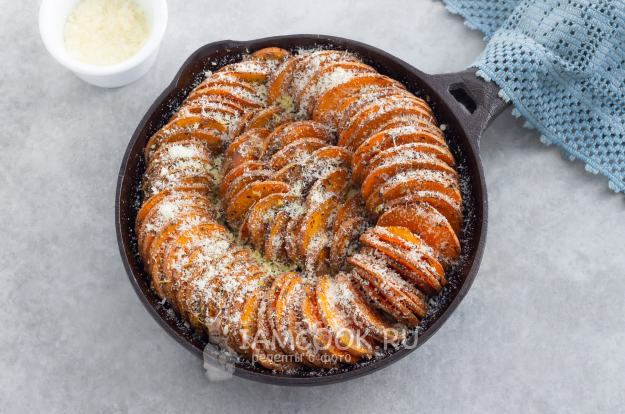 Затем присыпьте батат натертым сыром. Я добавляю сыр тонким слоем, для того чтобы был виден цвет и рисунок, которым ломтики батата выложены в форму.