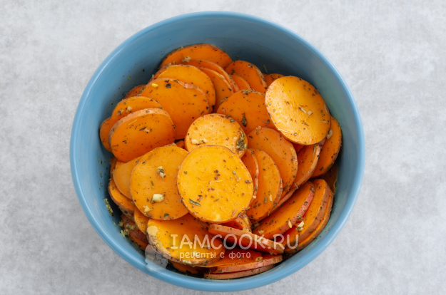 Сложите ломтики батата в миску или герметичный пакет и добавьте оставшуюся масляную заправку с чесноком и специями.