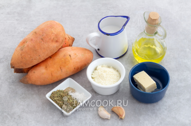 Включите духовку, чтобы она прогрелась до 200 градусов Цельсия. Соберите продукты по списку к рецепту и начнем готовить гратен из батата в духовке.