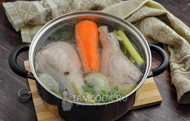 Возьмите достаточно большую кастрюлю, положите в нее голени, все овощи и специи и залейте кипятком из чайника. Можно просто вскипятить воду в кастрюле и опустить в нее голени индейки и овощи. Но в этом случае важно как-то рассчитать количество воды, чтобы при опускании мяса в воду, вода не выплеснулась. Поэтому мне проще с чайником и кипятком. Количество воды зависит от размера вашей кастрюли и размера голени. У меня ушло около 2,5-2,8 литров. Важно, чтобы голень полностью была покрыта водой.