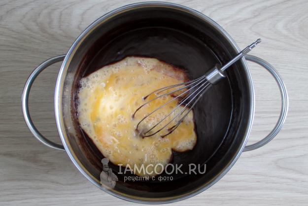 Довольно быстро масса станет теплой или комнатной температуры и можно вмешать в неё яичную массу, т.е. размешанные сырые яйца.