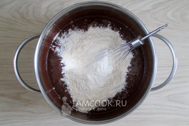 Затем добавьте муку с ванилином, перемешайте, но не взбивайте.