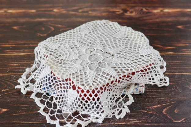 А теперь хочу показать несложный способ красиво украсить запеканку. Берёте бабушкину вязаную салфетку и кладёте на запеканку. Можно чётко по центру или со смещением - тут уж как вам ваш дизайнерский порыв подскажет. И поверх салфетки посыпаете через ситечко сахарной пудрой. Затем нужно аккуратно салфетку снять.