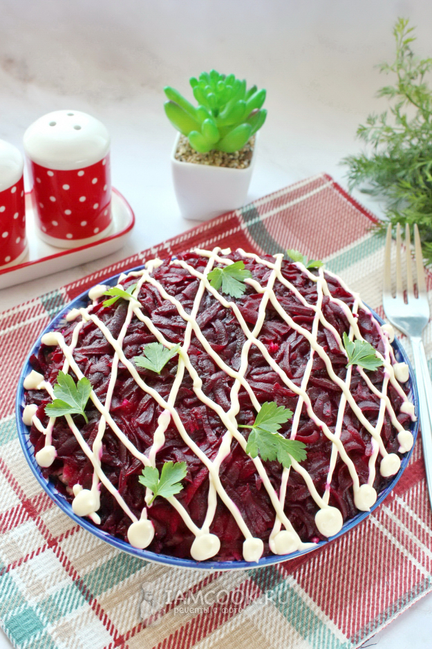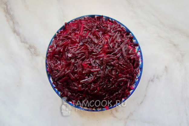 Свеклу отварите в кожуре, охладите и очистите. Натрите на терке и выложите верхним слоем салата.