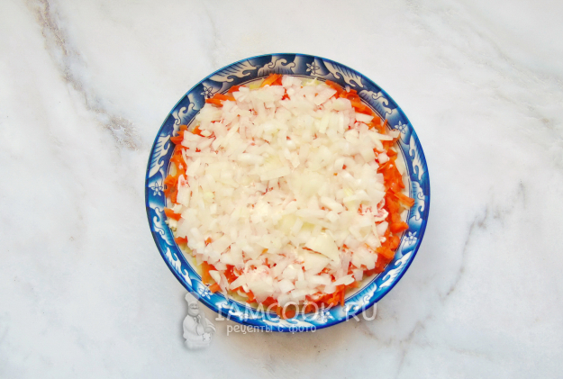 Репчатый лук очистите, помойте и мелко нарежьте. Выложите в мисочку и залейте кипятком. Через 10 минут воду слейте. В результате лук станет менее горьким. А можно сразу взять не горький салатный лук. Выложите лук на слой моркови.