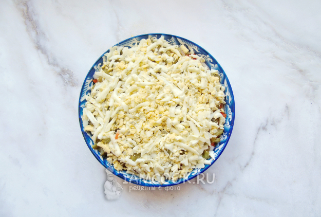 Яйца сварите вкрутую. Выложите в кастрюлю, залейте водой и доведите до кипения. С этого момента варите их 10 минут. Затем достаньте из кастрюли, обдайте холодной водой. Охладите, очистите и натрите на терке. Это будет следующий слой салата.