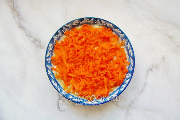 Морковь также отварите, охладите, очистите и натрите на терке. Выложите на картошку.