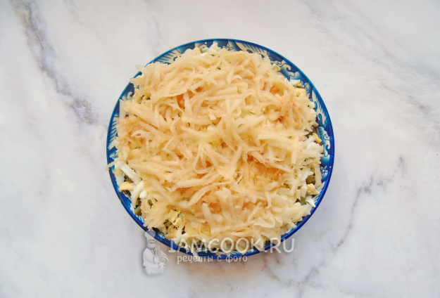 Кислое яблоко помойте, очистите и натрите на терке. Выложите на слой яиц. Яблоки можно не покрывать майонезом.