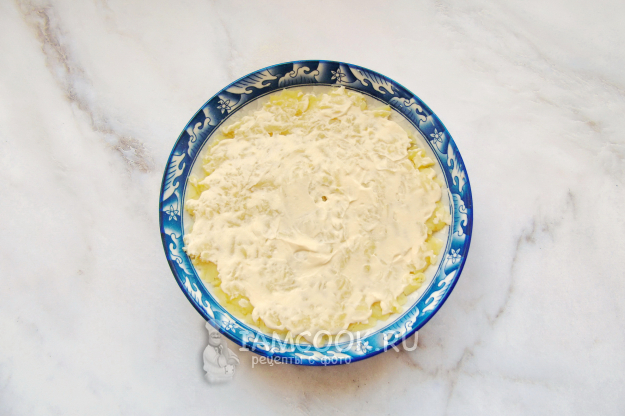 Картошку сварите в кожуре, в подсоленной воде, охладите и очистите. Натрите на терке и выложите первым слоем. Смажьте майонезом.