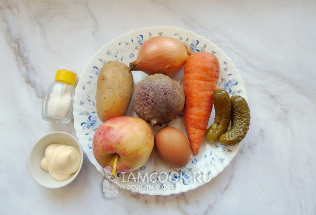Соберите ингредиенты для приготовления слоеного салата «Правительственный», которые перед вами - на фото.