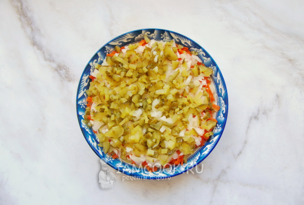 Соленые или маринованные огурцы мелко нарежьте и выложите на слой лука.