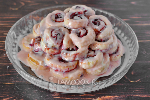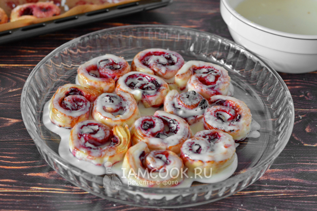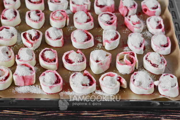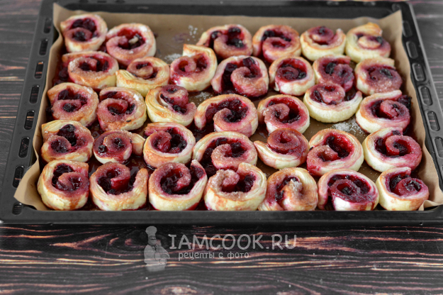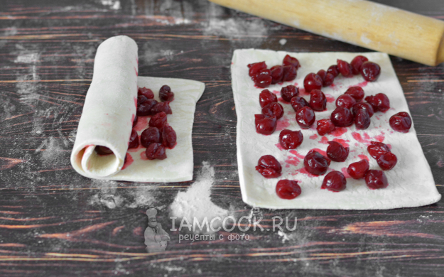 Подпылите поверхность мукой. Полностью размороженное слоеное тесто слегка раскатайте и разложите на него вишню. Сверните рулетом.