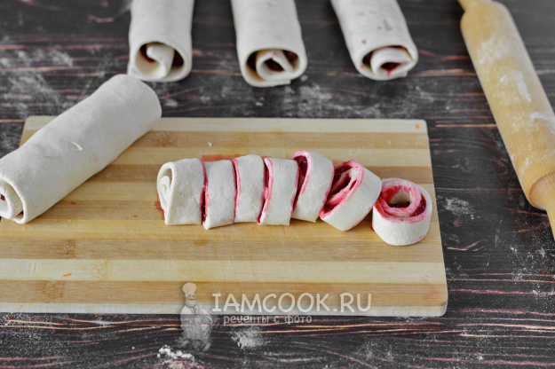 У меня в упаковке (500 г) было 5 штук уже нарезанных прямоугольников теста. Если у вас один большой кусок теста, то разрежьте его на куски, чтобы рулетики не были слишком большого размера.