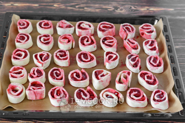 Застелите противень пергаментом и выложите кусочки рулетиков на небольшом расстоянии друг от друга.